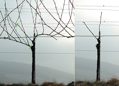 Winzerin und Winzer belassen beim Schneiden der Reben die gewünschte Anzahl Knospen oder Augen. Mit dem Rebschnitt wird die Menge und vor allem die Qualität des Traubengutes vorbestimmt.